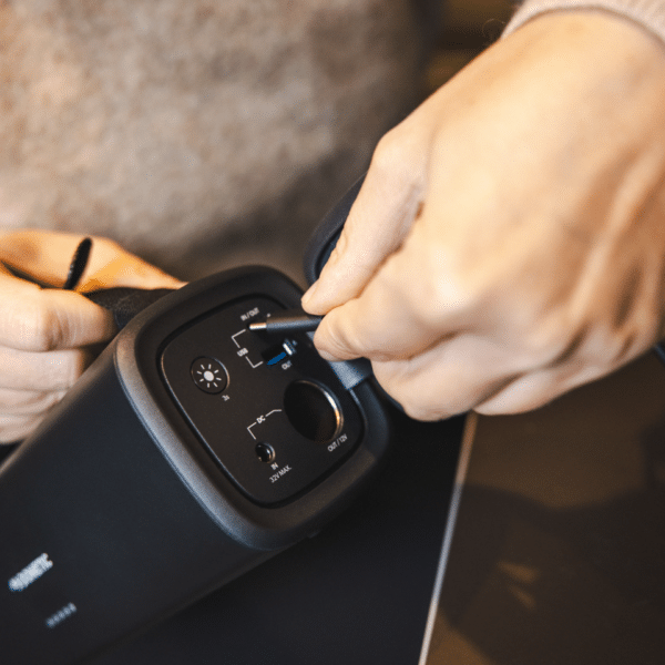 - USB-C- und DC-Eingang für Koaxialkabel – Die PLB15 kann über die Wandsteckdose, ein Autoladekabel oder mit einem Solarpanel geladen werden.